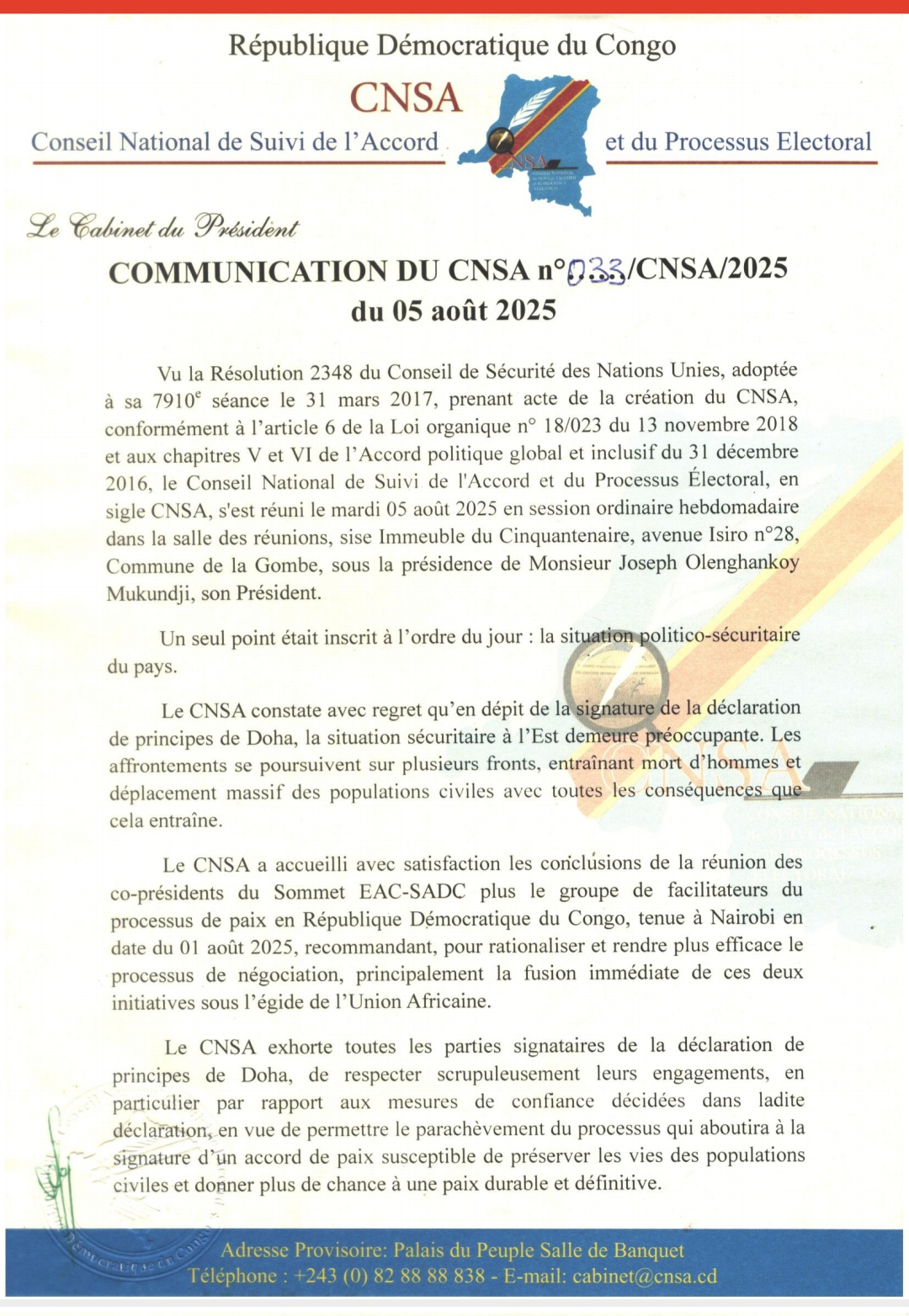 Face à ce constat d’échec, nous appelons solennellement le Chef de l’État, Félix Tshisekedi, ainsi que les membres influents du gouvernement et du Parlement, à prendre leurs responsabilités en procédant à la dissolution immédiate de la CNSA. Il est temps de mettre fin à cette structure obsolète, devenue un poids mort pour les finances publiques et une illusion pour le peuple congolais. Le tonnerre