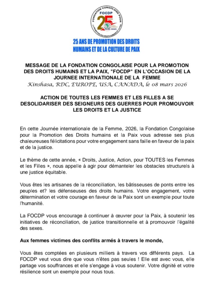 Dans sa déclaration publiée depuis Kinshasa, mais également relayée en Europe, aux États-Unis et au Canada, la FOCDP a félicité les femmes pour leur engagement constant en faveur de la paix et de la justice. L’organisation a souligné que le thème de cette année, « Droits, Justice, Action, pour toutes les Femmes et les Filles », constitue un appel à agir pour éliminer les obstacles qui empêchent l’accès à une justice équitable.