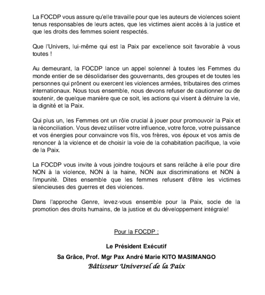 Ce message est signé par le président exécutif de la FOCDP, Sa Grâce Professeur Monseigneur Pax André Marie Kito Masimango, présenté comme un bâtisseur universel de la paix. LE TONNERRE