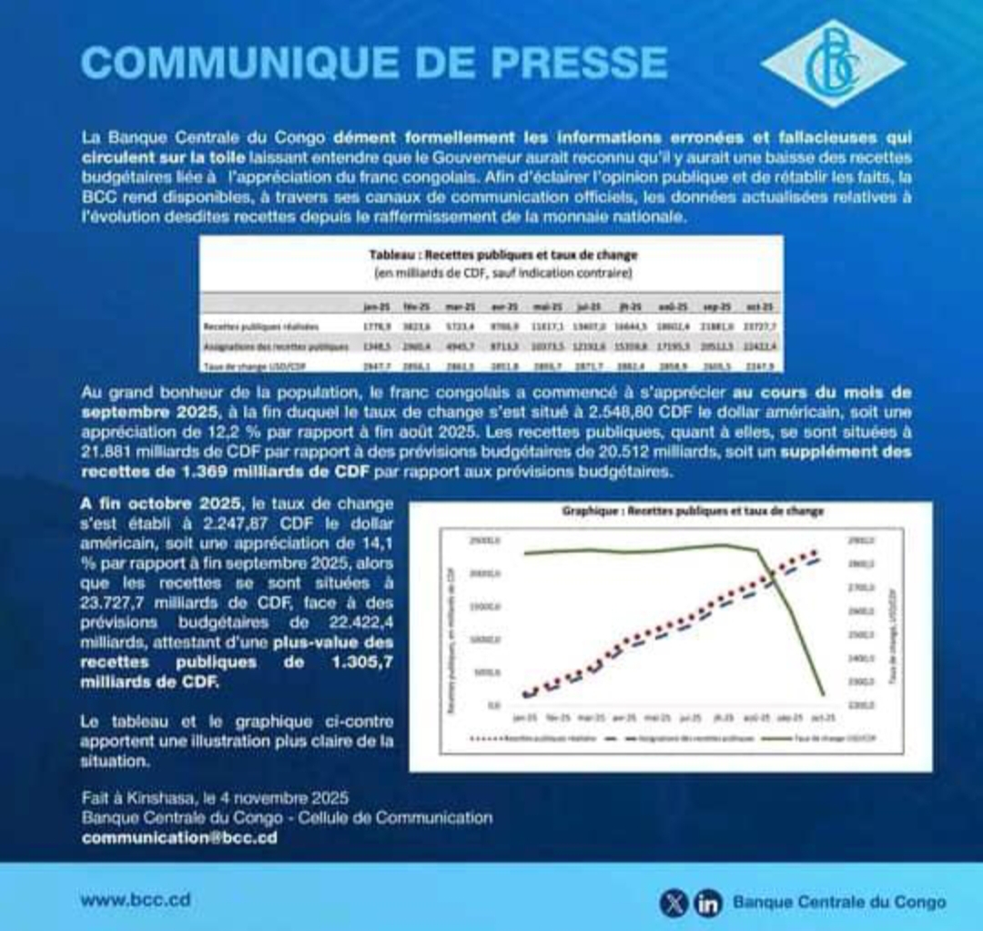 La Banque Centrale du Congo appelle donc chacun citoyens, médias, opérateurs économiques à se référer aux données officielles et à participer à la construction d’un discours économique fondé sur la vérité, la rigueur et la fierté nationale.