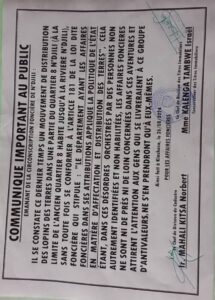 Depuis un moment, des personnes sans titre ni qualité, prétendument agents de l’Etat, qui sont en train de distribuer des lopins de terres aux gens. Il s’agit des lopins de terres situés au quartier 8 dans la commune de N’djili, précisément à la limite du quartier 8 habité jusqu’à la rivière N’djili. Et ce, en violation flagrante de l’article 181 de la Loi Foncière congolaise. En vue de protéger la population Kinoise contre tout désagrément qui peut découler de cette opération mafieuse, la Circonscription Foncière de N’djili a rendu public…