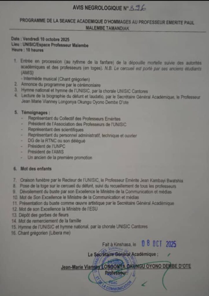 L’Université des Sciences de l’Information et de la Communication (UNISIC) consacrera la journée du vendredi 10 octobre 2025 à un hommage académique solennel en mémoire de son fondateur, le Professeur Émérite Paul Malembe Tamandiak, disparu le 1er septembre 2025 aux Cliniques Universitaires de Kinshasa.